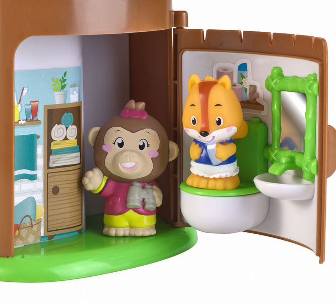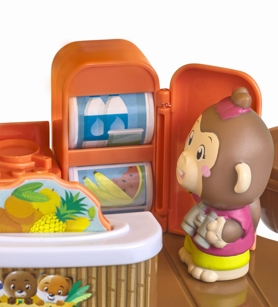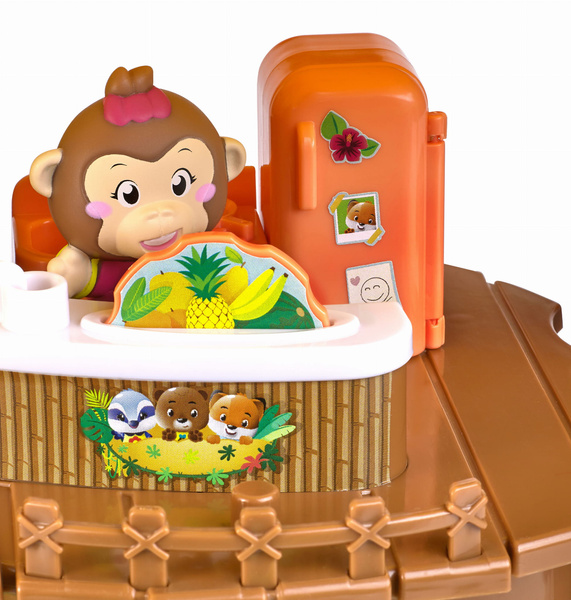 W kuchni małpka może przygotować koktajl owocowy dla swoich przyjaciół, otwórz lodówkę, pokręć wałkiem i wybierz czym jeszcze małpka może poczęstować gości. Łazienka schowana jest za dużymi liśćmi, nikt nie będzie mógł podejrzeć kąpiących się w dużej pianie zwierzątek. Przyjaciele do domku mogą wejść po schodach, które prowadzą do sypialni lub wjechać po lianie do kuchni.