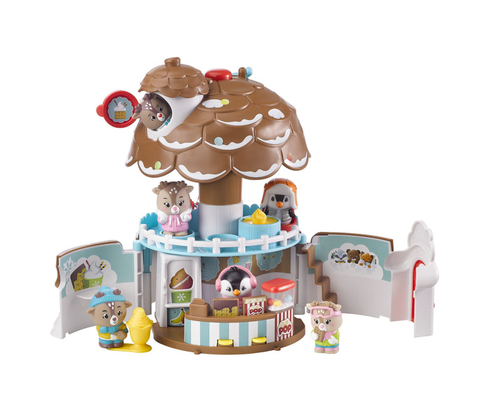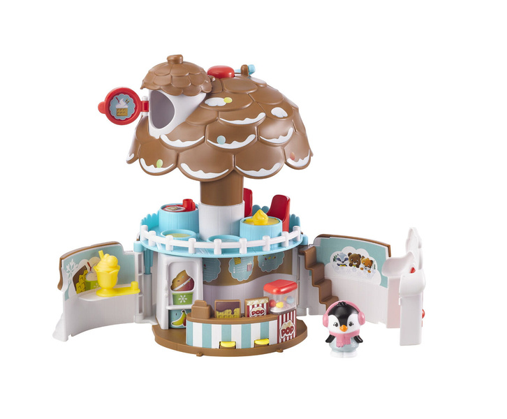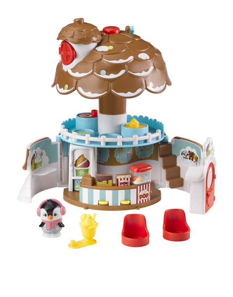 Naciśnij przycisk na szczycie dachu, aby lodziarnia się otworzyła. Domek ma dwa piętra i okno na dachu, w którym można postawić zwierzątko. Na piętrze lodziarni są dwa stoliki i fotele dla gości. Stoliki mają obrotowy blat, na których są różne rzeczy. Na parterze lodziarni jest blat z kasą i maszyną do popcornu. Po naciśnięciu guziczka popcorn będzie skakać w maszynie. Z blatu wyskakują gorf z czekoladą i opakowanie z popcornem po naciśnięciu przycisków. Obróć wałeczek aby wybrać smak lodów. A potem podaj lody gościom.