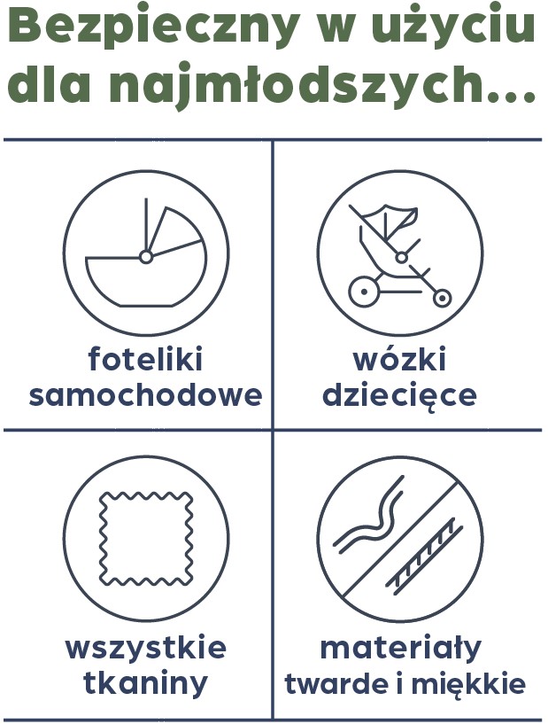 Wysokiej jakości środek do czyszczenia twardych i miękkich powierzchni, o silnych właściwościach antybakteryjnych i bez jakichkolwiek dodatków chemicznych. Jego aktywne składniki pomagają usunąć plamy z tkanin, tłuszcz i brud, pozostawiając fotelik samochodowy i wózek dziecka higienicznie czyste, a powierzchnie nie będą już lepkie.