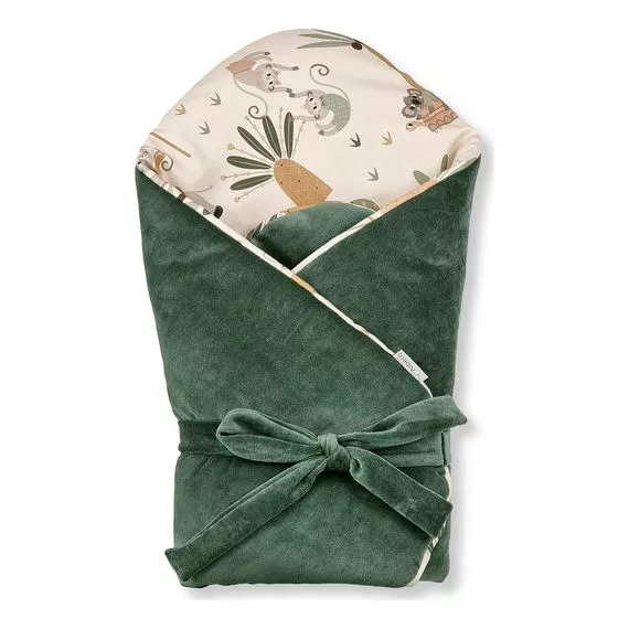 Rożek niemowlęcy Zabawa w tropikach to niezwykle uroczy i funkcjonalny produkt, stworzony z myślą o noworodkach i ich rodzicach. Wykonany z wysokiej jakości satyny bawełnianej oraz weluru bawełnianego, zapewnia on nie tylko miękkość i delikatność dotyku, ale także bezpieczeństwo i komfort podczas codziennego użytkowania. Satyna bawełniana, z której wykonany jest różek, to tkanina naturalna i przyjazna dla skóry dziecka. Posiada nadruk bawiących się zwierzątek pośród tropikalnych drzew, który dodaje produktowi wyjątkowego charakteru. Druga strona wykonana jest z miękkiego i przyjemnego w dotyku weluru bawełnianego. Rożek ma wszyte antyalergiczne wypełnienie, które w doskonały sposób izoluje ciepło i przepuszcza powietrze. Nie posiada dodatkowego usztywnienia, dzięki czemu zapewnia utrzymanie naturalnej i wygodnej dla noworodka pozycji. Wiązany na kokardę, pozwala na indywidualne dopasowanie rozmiaru rożka do wymiarów i potrzeb niemowlaka. Wyprodukowany w Polsce. Zastosowane tkaniny posiadają certyfikat Oeko – tex gwarantujący bezpieczeństwo dla najmłodszych. Produkt należy stosować pod opieką osoby dorosłej! Producent informuje, że pokazana na zdjęciu kolorystyka może nieznacznie różnić się od rzeczywistego produktu. Zastosowany nadruk jest ekologiczny – najlepszy dla tkanin wykorzystywanych w produktach dziecięcych, może jednak delikatnie blaknąć podczas prania i ekspozycji na światło słoneczne. Rozmiar (po rozłożeniu): 75x75 cm Tkanina 1: satyna bawełniana - 100% bawełna, Tkanina 2: jednobarna welur - 100% bawełna Wypełnienie: antyalergiczna włóknina silikonowa - 100% poliester