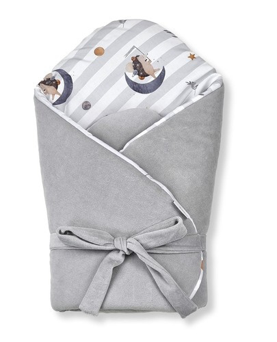 Rożek ma wielofunkcyjne zastosowanie: służy jako otulacz dla noworodków, a po rozpięciu jako kołderka czy mata do zabawy.