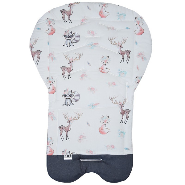 Zwiększa komfort podróżowania po nierównościach. Może być użytkowana obustronnie. Wkładka ma uniwersalne zastosowanie w każdym wózku spacerowym. Świetnie dopasowuje się do wózka i dziecka. Ze względu na różne szerokości pasów zabezpieczających w wózkach otwory są zaszyte. Żeby dostosować produkt do wózka, należy przeciąć otwory w odpowiednich wyhaftowanych punktach.