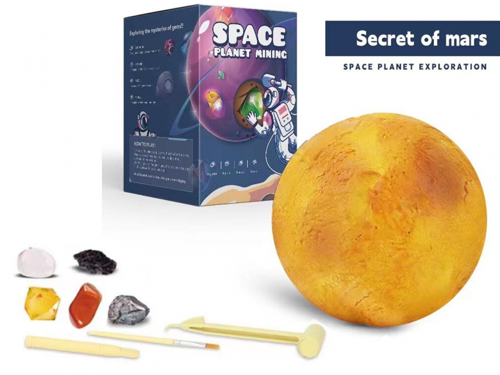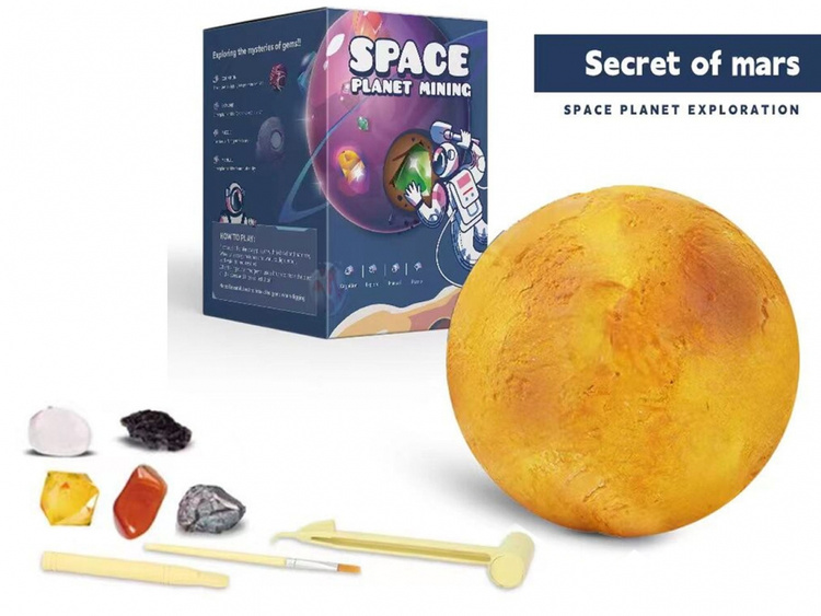 Mars wykopaliska, minerały 10x10 cm. Zestaw zawiera jedną z planet naszego układu słonecznego, która ukrywa w sobie ukryte kamyki archeologiczne. Za pomocą dołączonego dłuta, dzieci będą miały możliwość wydobycia minerałów.