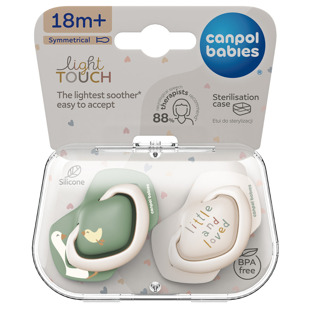 Smoczek uspokajający Light Touch marki Canpol to rekomendacja neurologopedów jako idealny smoczek, dla dzieci w wieku powyżej 18 miesięcy. Jego wyjątkowo lekka konstrukcja nie obciąża zgryzu, co – jak wskazuje 93% neurologopedów – wspiera prawidłowy rozwój jamy ustnej dziecka. Dzięki symetrycznemu, fizjologicznemu kształtowi smoczek doskonale dopasowuje się do buzi dziecka bez względu na pozycję. Miękka, hipoalergiczna silikonowa gumka smoczka wymaga minimalnego wysiłku podczas ssania, co sprzyja łatwej akceptacji smoczka przez dziecko. Wyprofilowana tarczka zapewnia wygodne oddychanie przez nosek, a wentylacyjne otwory minimalizują ryzyko podrażnień skóry. Wygodne etui pełni funkcję przechowywania i umożliwia szybką sterylizację w kuchence mikrofalowej, zapewniając wysoki poziom higieny.