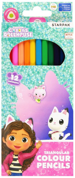 Zestaw 12 kredek ołówkowych z kolekcji STARPAK z licencją Gabby's Dollhouse. Kredki w żywych barwach o wysokiej jakości rysików zapewniają łatwość rysowania i dokładne pokrycie malowanej powierzchni. Nie łamią się podczas strugania. Zapakowane w kartonowe pudełko z zawieszką, ułatwiające przechowywanie.
