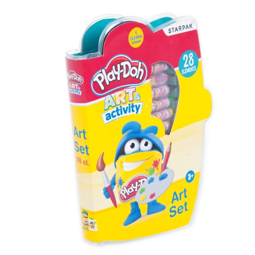 Poręczny zestaw artystyczny z licencją Play-Doh, który idealnie mieści się w dziecięcym plecaku. W skład zestawu wchodzi 28 elementów, w tym 8 kredek woskowych, 12 farb akwarelowych, pędzelek, ołówek, temperówka, gumka do mazania i 4 kolorowanki ulubionymi bohaterami. Wszystko zapakowane w kolorowe, trwałe pudełko.