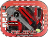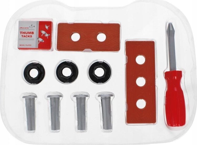 Zawartość zestawu: pinezki tapicerskie, 2x deseczka, 7x śruba, 4x nakładka na śruby, śrubokręt, imadło, nóż tapicerski, kombinerki, klucz francuski.