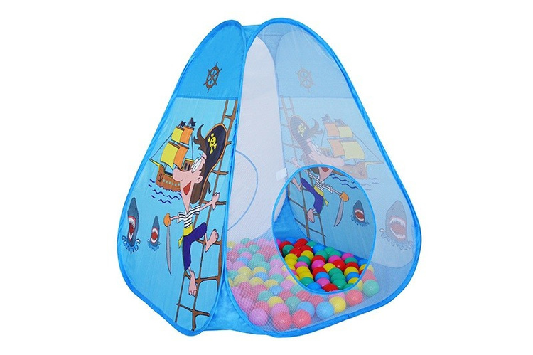 W ZESTAWIE: NAMIOT PIRATA, 100 PIŁECZEK O ŚR. 6 CM., WYMIARY PO ROZŁOŻENIU: 95 X 95 X 100 CM, WYKONANY Z NIEPRZEMAKALNEGO MATERIAŁU, ŁATWY I SZYBKI MONTAŻ, ELASTYCZNY STELAŻ,WYM. OPK: 50 X 16 X 34 CM, 3+