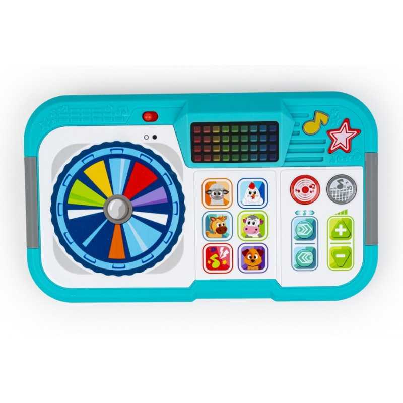 Baw się dźwiękiem, tworząc własną muzykę! Mikser posiada dotykowy panel do scratchu w kształcie płyty winylowej, a także szereg aktywnych przycisków do zmiany dźwięku. Znajdziemy tu obrazki ze zwierzątkami, których naciśnięcie uruchamia realistyczne odgłosy. Z prawej strony zabawki znajdują się dwa okrągłe przyciski, pierwszy odpowiada za uruchamianie beatów, a drugi, melodii. Niebieskie przyciski zwiększają i zmniejszają tempo, a zielone, regulują głośność. Podczas zabawy, w kolorowym okienku na górze widoczne są efekty świetlne. Produkt przeznaczony jest dla dzieci od 12 miesiąca życia.